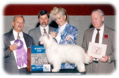 Ch. Bayshore's Peter Pan"Pan"Shown here winning Winners Dog at the Chinese Crested Club of Potomac under the late Mr. James Cavalerro. Handled by his co-owner Randy Whitacre.